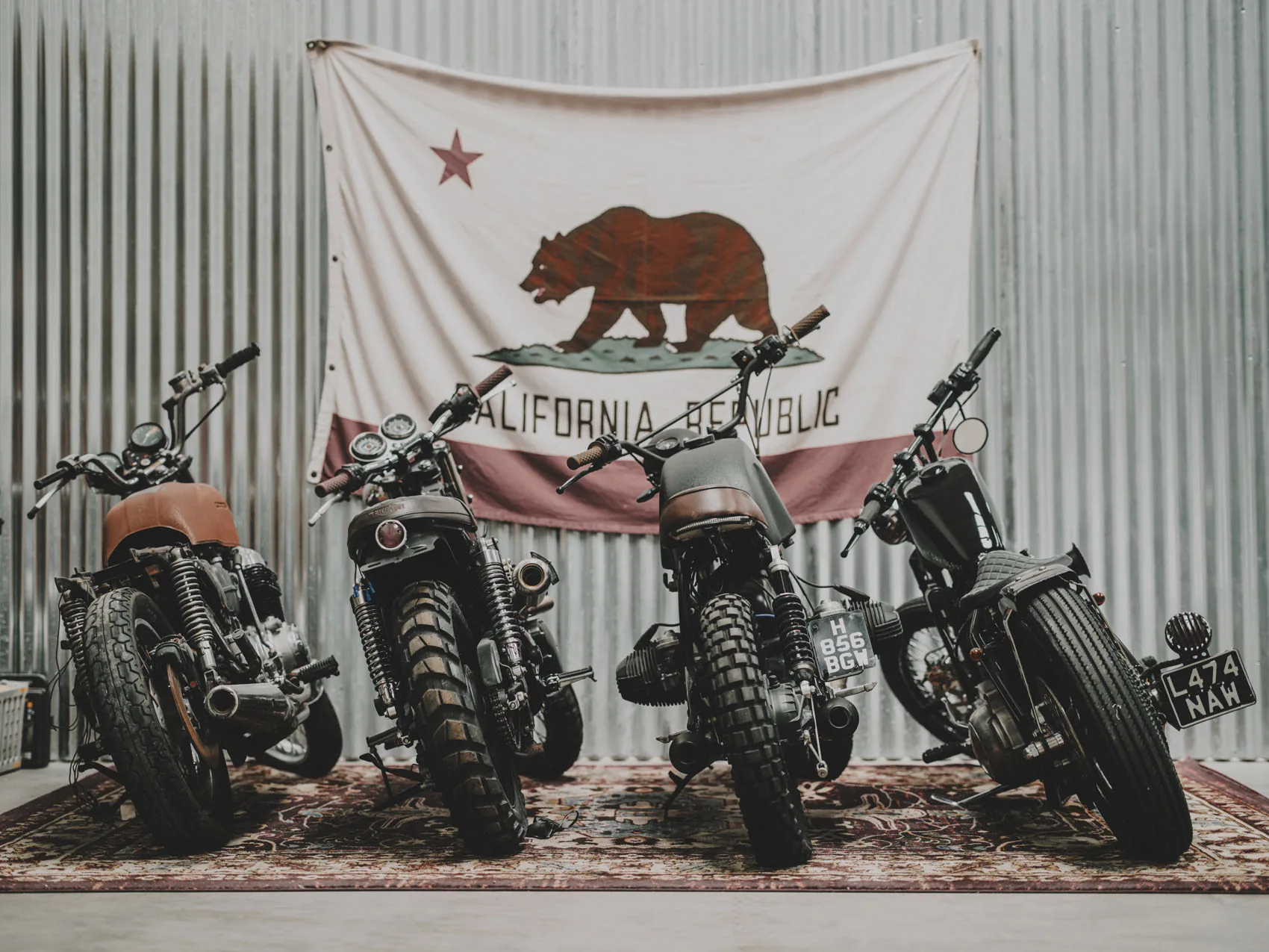 Set against corrugated metal, a California flag, and a wall of vintage tools, plates, and wrenches.